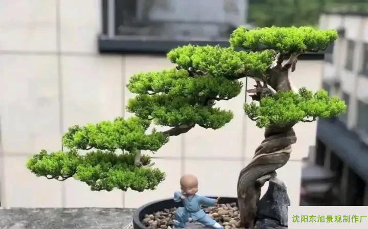 如此使得自然美与艺术美和谐统一,沈阳仿真盆景艺术品形成了种类齐全、形式多样、特别是根盘显露、排列有序,树冠秀茂、枝干流畅,疏密有致、刚柔相济的独特风格,这就是仿真盆景也能所及的盆景艺术之道。